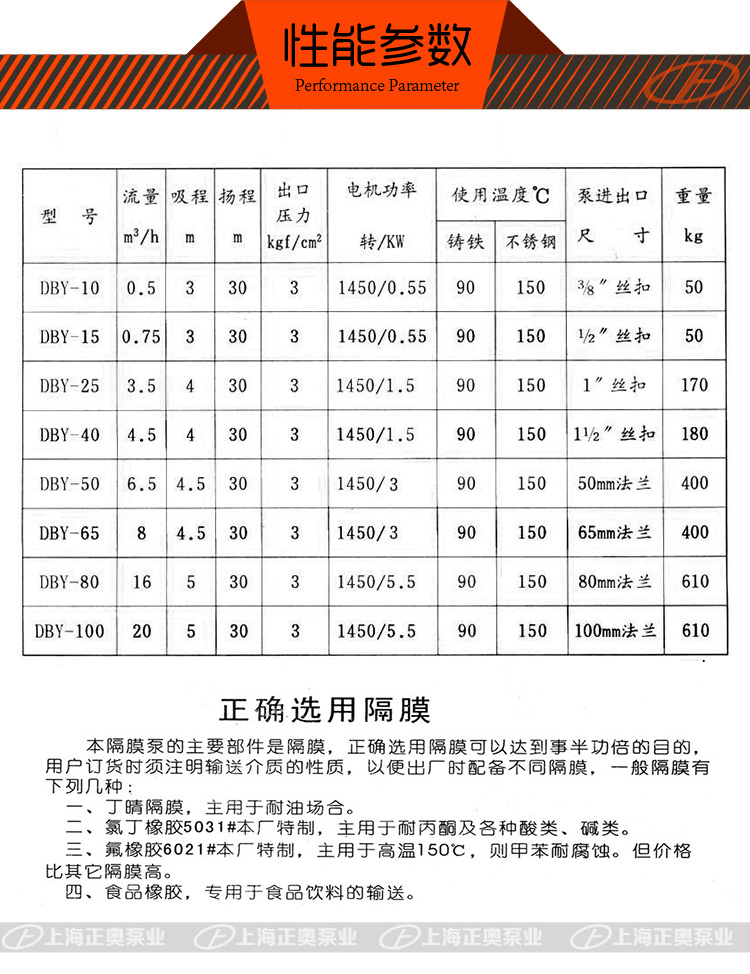 3、由于隔膜將被輸送介質(zhì)和傳動機械件分開,所以介質(zhì)不會向外泄漏;且泵本身無軸封,使用壽命大大延長;根據(jù)不同介質(zhì),隔膜可分為氯丁橡膠、氟橡膠、丁晴橡膠、聚四氟已烯、特氟龍(F46)等,可以滿足不同客戶的要求。