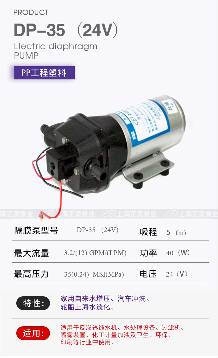DP微型電動隔膜泵適用于家用自來水增壓、汽車沖洗、輪船上海水淡化,DP隔膜泵適用于反滲透純水機、水處理設備、過濾機、噴霧裝置、化工計量加液及衛生、環保、印刷等行業中使用。