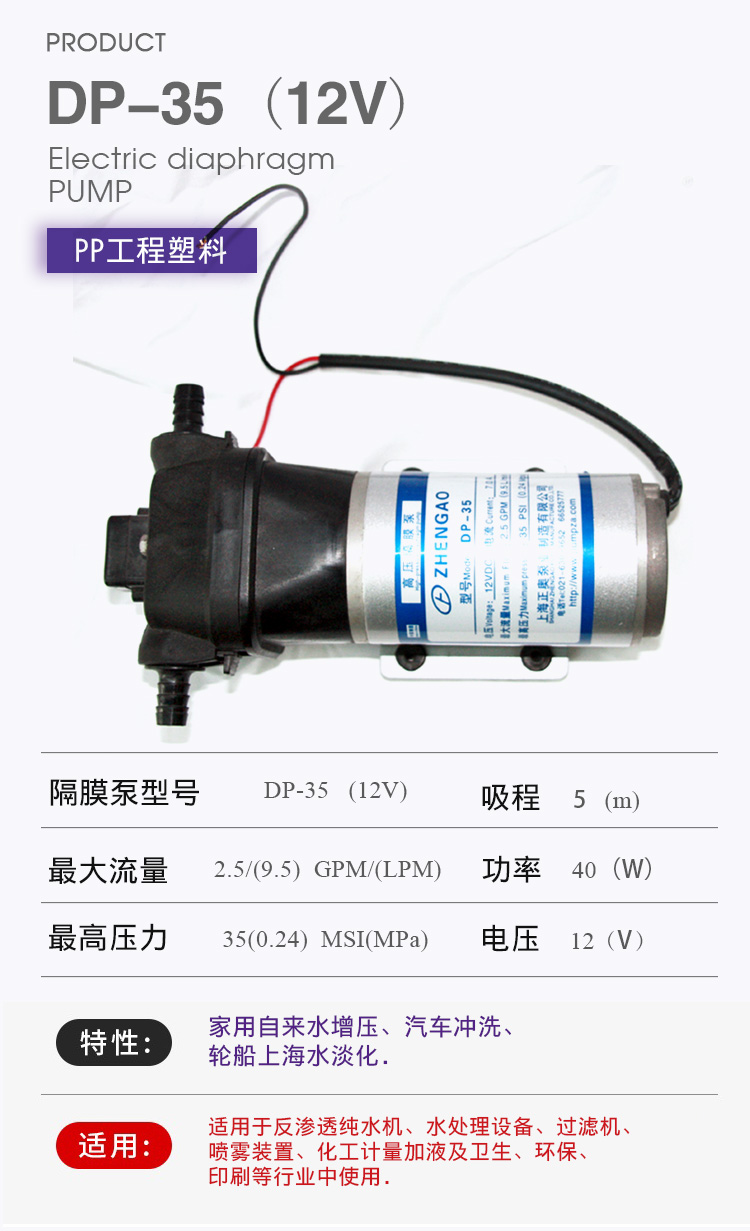 DP微型電動隔膜泵適用于家用自來水增壓、汽車沖洗、輪船上海水淡化,DP隔膜泵適用于反滲透純水機、水處理設備、過濾機、噴霧裝置、化工計量加液及衛(wèi)生、環(huán)保、印刷等行業(yè)中使用。