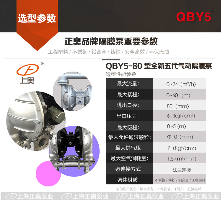 QBY5-80F型塑料氣動隔膜泵是我公司開發的第五代氣動隔膜泵,QBY5型正奧氣動隔膜泵是上海正奧泵業有限公司氣動隔膜泵的外形進一步改進,機械外觀更美;不卡機,無油氣動隔膜泵。