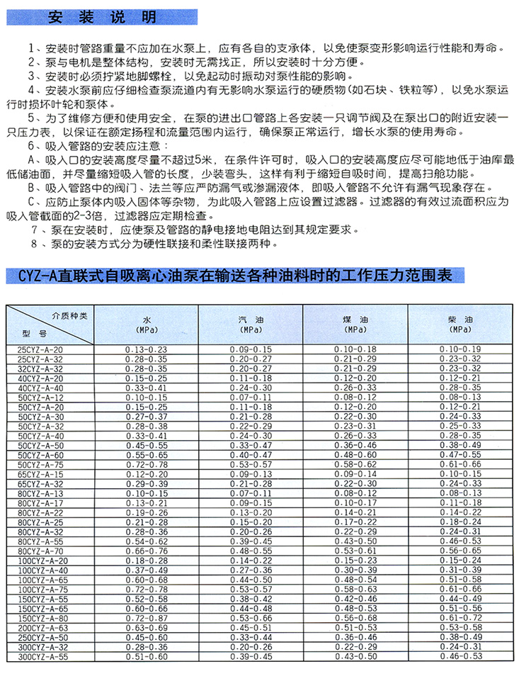 CYZ-A型自吸式直聯自吸油泵該自吸泵適用于石油行業、陸地油庫、油罐車的理想產品,并適合于作船用貨油泵、艙底 泵、消防泵和壓載泵及機器冷卻水循環等,分別輸送汽油、煤油、柴油、航煤等石油產品和海水、清水,介質溫度-20℃-80℃,如輸送化工液體可改用耐腐蝕 機械密封。