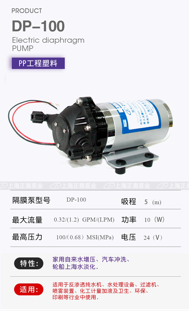 DP微型電動隔膜泵適用于家用自來水增壓、汽車沖洗、輪船上海水淡化,DP隔膜泵適用于反滲透純水機、水處理設備、過濾機、噴霧裝置、化工計量加液及衛生、環保、印刷等行業中使用。