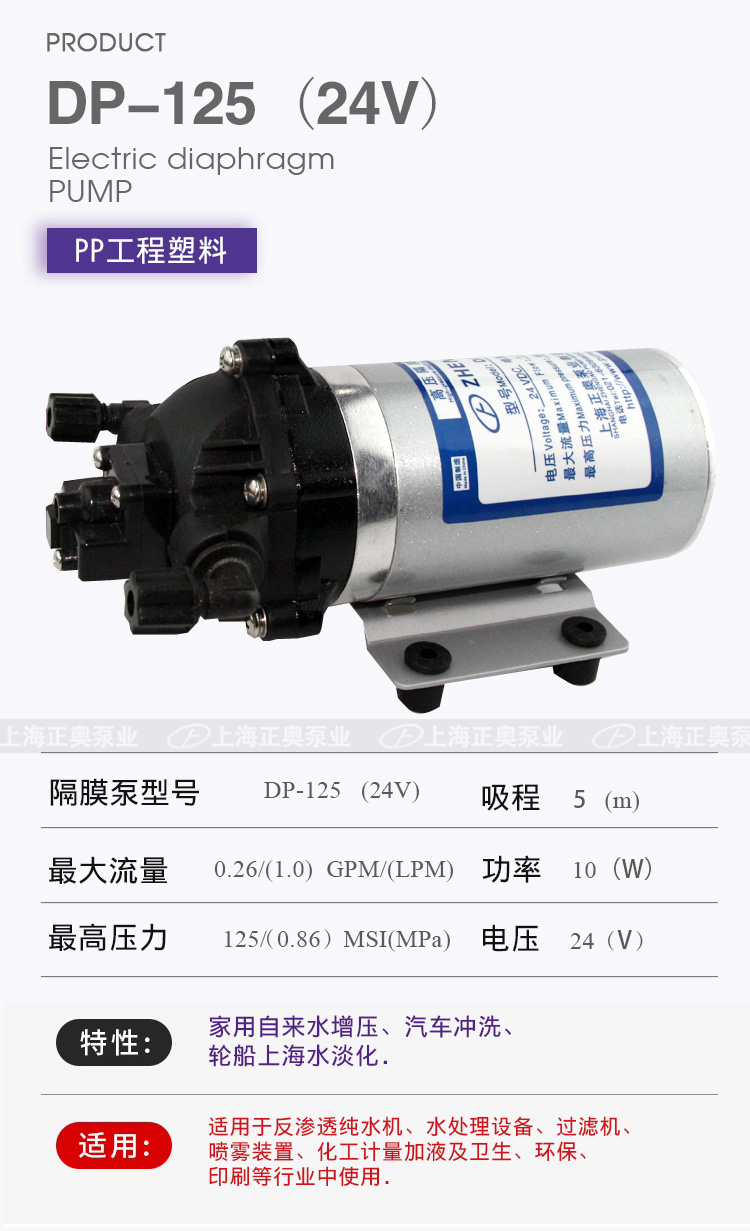 DP微型電動隔膜泵適用于家用自來水增壓、汽車沖洗、輪船上海水淡化,DP隔膜泵適用于反滲透純水機、水處理設備、過濾機、噴霧裝置、化工計量加液及衛生、環保、印刷等行業中使用。