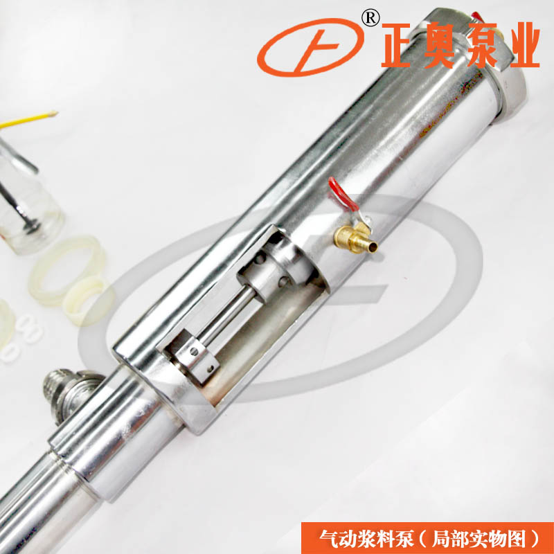 本產品采用氣壓差的作用,使活塞上下運行,帶動導料活塞開閉,起到提料的作用。調整給氣動漿料泵工作氣體的流量與氣壓來控制和調節氣動漿料泵送料流量。結合感應開關能使之自動化工作。