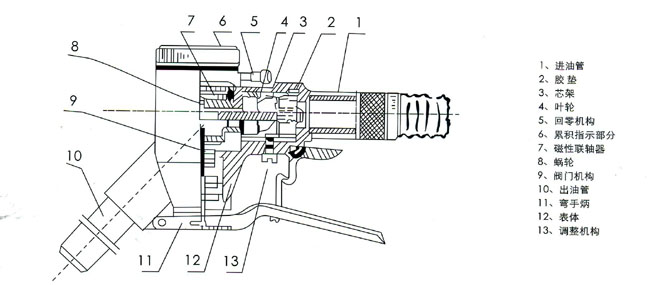 4、計量加油槍在出廠前已調整校驗合格,用戶一般不能隨意拆卸,必須拆開時,應按下列順序:(1)擰下歸零按鈕套,取下按鈕;(2)擰下表蓋;(3)用專用扳手擰下壓圈;(4)取下齒輪傳動機構;(5)擰下葉輪室上邊的連接介輪。(6)卸下進入管;(7)把葉輪室部分從槍體的進入口取出。