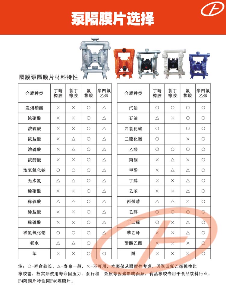 流體部件材質有:鋁合金、鑄鐵、聚丙烯、不銹鋼、隔膜根據不同膜片材質分別有:丁晴橡膠、氯丁橡膠、聚乙烯、聚膠、聚醚橡膠、氟橡膠、氟塑料、特氟隆。以滿足不同液體介質的需要。
