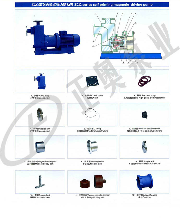 上奧牌ZCQ型自吸式磁力驅(qū)動(dòng)泵(以下簡(jiǎn)稱(chēng)自吸泵)該泵以靜密封取代動(dòng)密封,使泵的過(guò)流部件處于完全密封狀態(tài),解決了其它泵機(jī)械密封無(wú)法避免的跑、冒、滴、漏之弊病,泵體及過(guò)流部件的材料均采用了耐腐蝕的不銹鋼、鋼玉陶瓷、四氟石墨等材料制造,既有CQ型磁力驅(qū)動(dòng)泵的功能,又集皂吸于一身,不需底閥和引灌水,自吸高度4米。