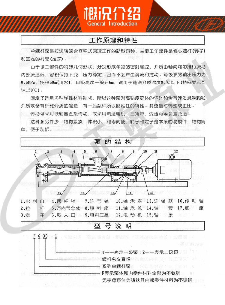 整體不銹鋼單螺桿泵在發達國家已廣泛使用,國外多數稱單螺桿泵“莫諾泵”《MONOPUMPS》,德國稱“偏心轉子泵”。由于其優良的性能,近年來在國內的應用范圍也在迅速擴大。它的特點是對介質的適應性強、流量平穩、壓力脈動小、自吸能力高,這是其它任何泵種所不能替代的。我們國外(如:德、英、法、日本等國)生產的單螺桿泵及國內同行業的產品,作了分析與研究,博取眾長,對自已的產進行不斷的改革創新。目前我單位的產品已自成一體系,壓力為0.4∽1.2MPa,可滿足廣大用戶對單螺桿泵的不同需求。我單位生產的泵,質量可靠,實行三包,價格也相對較低,同時確保備件的正常供應。本單位熱忱為廣大用戶服務,接受用戶對特殊要求單螺桿泵的設計和制造任務。