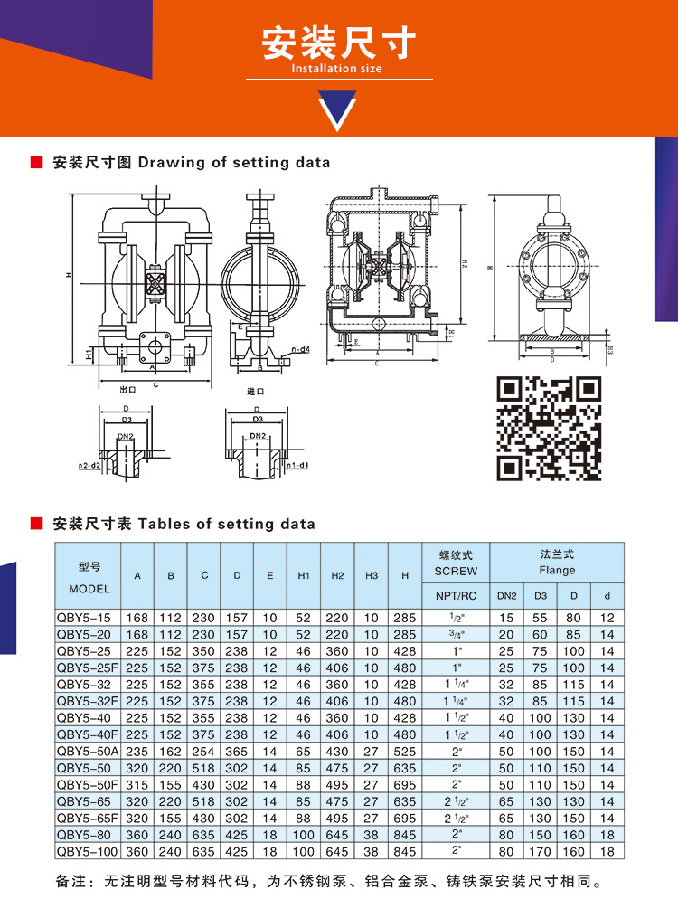 正奧公司生產(chǎn)的隔膜泵共有十二種規(guī)格。進出口尺寸分別為1/4”(10mm)、1/2”(15mm)、3/4”(20mm)、1”(25mm)、1.2”(32mm)1.5”(40mm)、2”(50mm)、2.5”(65mm)3”(80mm)、4”(100mm)流體部件材質(zhì)有:鋁合金、鑄鐵、工程塑料、不銹鋼、隔膜片根據(jù)不同膜片材質(zhì)分別有:丁晴橡膠、氯丁橡膠、聚乙烯、聚膠、聚醚橡膠、氟橡膠、氟塑料、特氟隆。以滿足不同液體介質(zhì)的需要。
