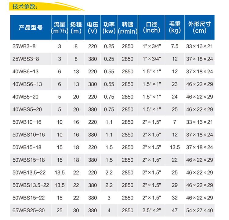 | 產品型號 | 最大流量(m3/h) | 最高揚程(m) | 額定功率(kW) | 電壓(V) | 口徑(mm) | 毛重(kg) | 包裝尺寸(cm3) |