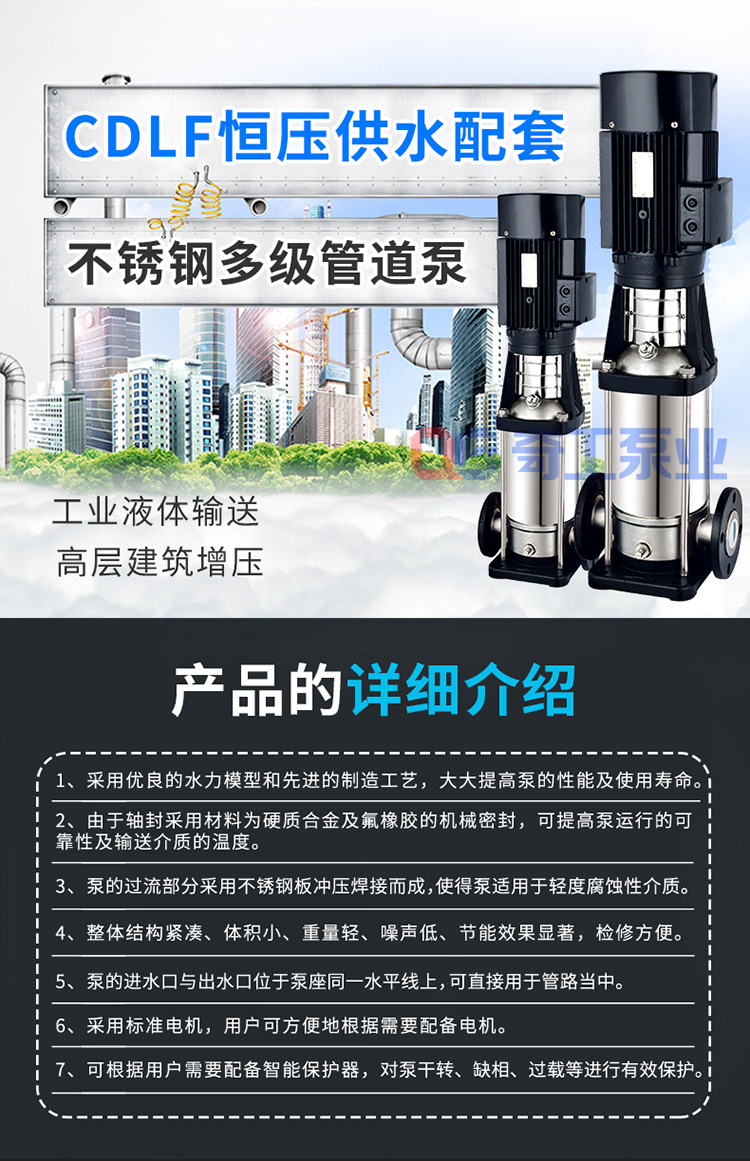 CDLF-16型不銹鋼立式多級(jí)泵(以下簡(jiǎn)稱多級(jí)離心泵)是吸取了國(guó)內(nèi)外技術(shù)而設(shè)計(jì)制造的非自吸立式多級(jí)離心泵,采用標(biāo)準(zhǔn)立式電機(jī)和快裝式機(jī)械密封,更換非常方便。
