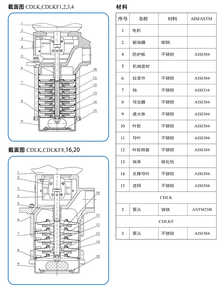 CDLK/CDLKF為安裝標準電機的自吸立式多級離心液下泵,電機軸通過泵頭用聯軸器直接與泵軸聯接,泵可根據需要配置智能保護器,對泵干轉、缺相、過載等進行有效保護。為滿足水槽或容器的安裝深度,可安裝空腔體來改變泵本身的長度,不同的級數長度見尺寸和重量表和可供產品范圍表。